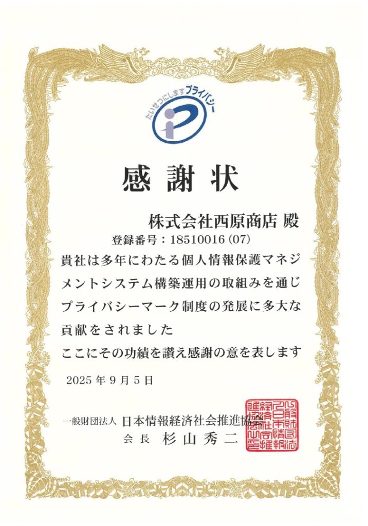 このたび当社は、日本情報経済社会推進協会(JIPDEC)より、長年にわたる個人情報保護マネジメントシステムの構築・運用への取り組みが評価され、感謝状を頂きました。